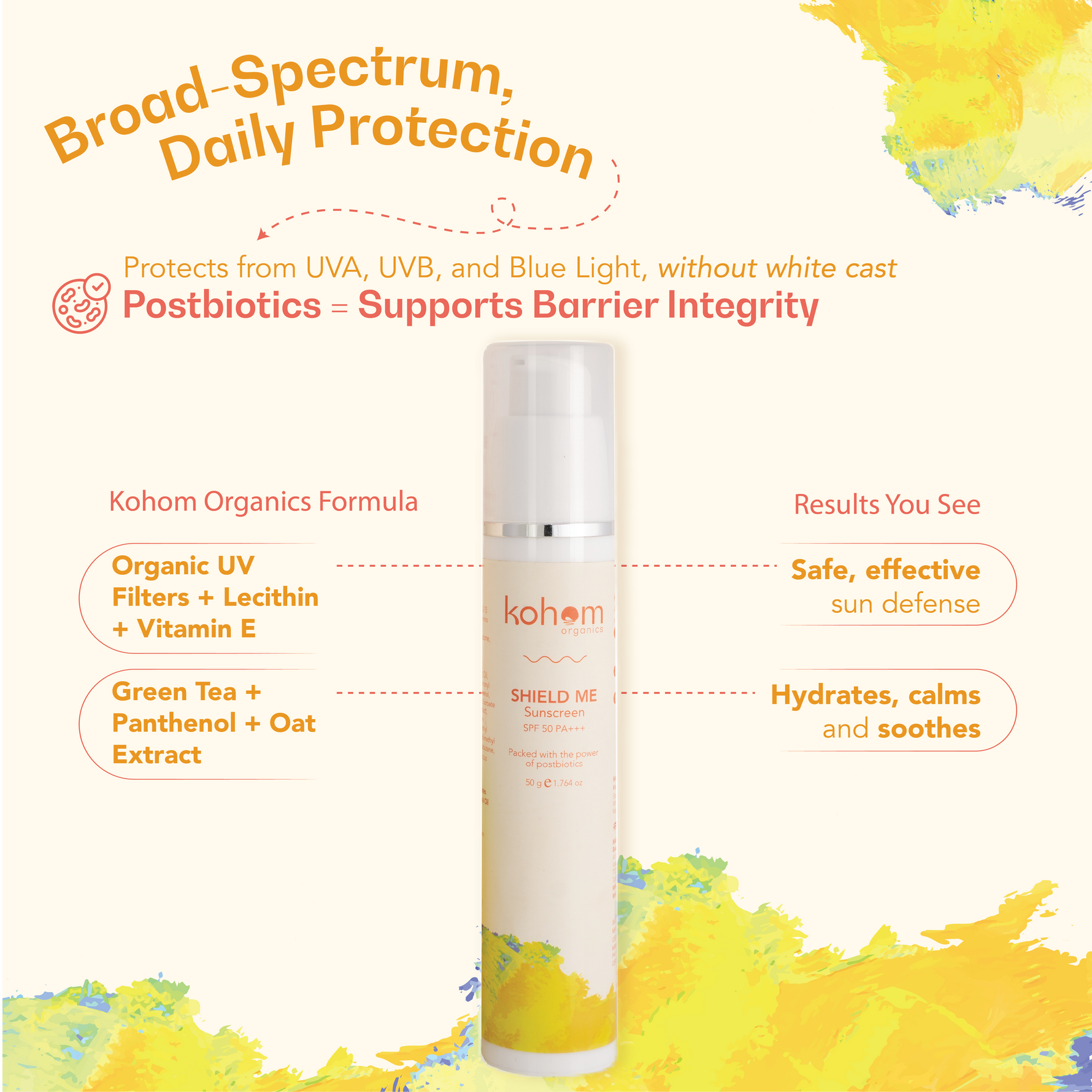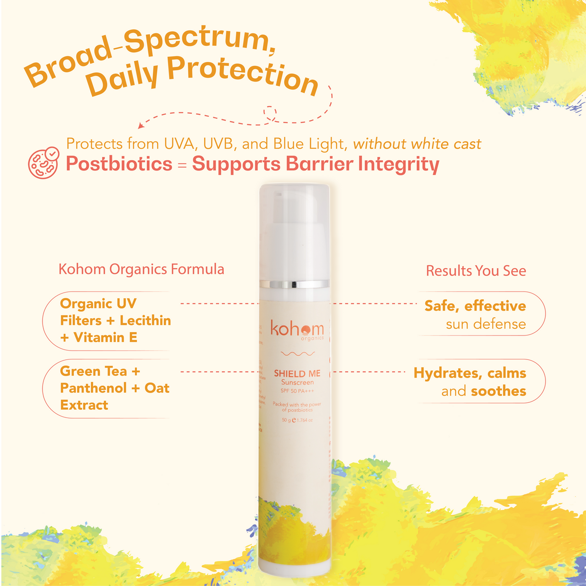 This one’s the everyday essential the Kohom family never skips. Made with emulgel technology and enriched with postbiotics, it protects like a bodyguard and cares like skincare. With SPF 50 PA+++ and organic UV filters, it shields your skin barrier from sun, pollution, and blue light, all while hydrating and soothing your skin. Think of it as sunscreen that doesn’t just sit on top, it works with your skin for true skin longevity.